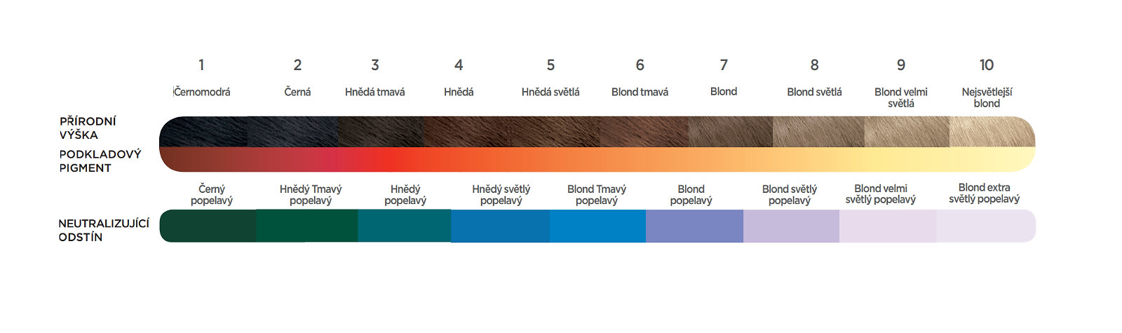 Aby ste pochopili ako toner funguje, je nutné si najskôr pripomenúť niečo málo z chémie. Vo vlasoch máme dva hlavné druhy pigmentu: eumelanín (hnedý až čierny pigment) a pheomelanin (žltý, oranžový až svetlo červený pigment). Pri procese odfarbenie potom dochádza k odstráneniu eumelanínu, zatiaľ čo feomelanín je ovplyvnený len minimálne. Výsledkom je, že sa tmavé vlasy zosvetlí na žltý odtieň, pretože v nich zostane veľké množstvo feomelanínu. Naopak pri svetlejších vlasoch, ktoré mali feomelanínu menej, je to svetlo žltá farba. Preto, kedykoľvek sa rozhodnete zosvetliť/odfarbiť vlasy, vždy budete bojovať s teplými tónmi (viď obr. nižšie), a to najmä vtedy, keď zosvetľujete o viac stupňov a vlasy sú tmavé. Tu prichádza na rad vlasový toner.