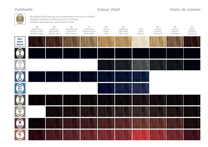 BLACK 1: Aqua • Cetearyl Alcohol • Toluene-2,5-Diamine • m-Aminophenol • Bis-Diglyceryl Polyacyladipate-2 • PEG-40 Hydrogenated Castor Oil • Sodium Cetearyl Sulfate • 2,4-Diaminophenoxyethanol • Sodium Laureth Sulfate • CI 77499 GRAPHITE 1.1: Aqua • Cetearyl Alcohol • Bis-Diglyceryl Polyacyladipate-2 • PEG-40 Hydrogenated Castor Oil • Toluene2,5-Diamine • Sodium Cetearyl Sulfate • Sodium Laureth Sulfate • m-Aminophenol • 2,6-Diaminopyridine • CI 77499. BLUE BLACK 2: Aqua • Cetearyl Alcohol • Toluene-2,5-Diamine • Bis-Diglyceryl Polyacyladipate-2 • PEG40 Hydrogenated Castor Oil • Sodium Cetearyl Sulfate • Sodium Laureth Sulfate • 2,6- Diaminopyridine • CI 77007. DEEP BLUE 2.1: Aqua • Cetearyl Alcohol • Bis-Diglyceryl Polyacyladipate-2 • PEG-40 Hydrogenated Castor Oil • Toluene-2,5-Diamine • 2,4-Diaminophenoxyethanol • Sodium Cetearyl Sulfate • Sodium Laureth Sulfate • CI 77007. NATURAL BROWN 3: Aqua • Cetearyl Alcohol • Toluene-2,5-Diamine • Bis-Diglyceryl Polyacyladipate-2 • PEG-40 Hydrogenated Castor Oil • Sodium Cetearyl Sulfate • m-Aminophenol • Sodium Laureth Sulfate • CI 77499 • CI 77491 • CI 77492. LIGHT BROWN 3.1: Aqua • Cetearyl Alcohol • Bis-Diglyceryl Polyacyladipate-2 • PEG-40 Hydrogenated Castor Oil • Toluene-2,5-Diamine • Resorcinol • Sodium Cetearyl Sulfate • Sodium Laureth Sulfate • CI 77499 • CI 77491 • CI 77492. CHESTNUT 4: Aqua • Cetearyl Alcohol • Sodium Laureth Sulfate • Polysorbate 80 • Tetraaminopyrimidine • Toluene-2,5-Diamine • 2-Methylresorcinol • m-Aminophenol • CI 77491 • CI 77499 • CI 77492. RED 4.1: Aqua • Cetearyl Alcohol • Tetraaminopyrimidine • 2-Methylresorcinol • Sodium Laureth Sulfate • Polysorbate 80 • CI 77491