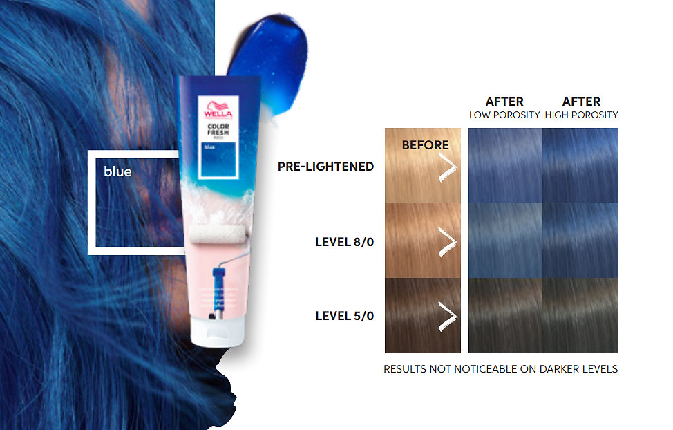 Blue - ideálne pre vopred zosvetlené / melírované vlasy na dodanie sýto modrého odtieňu - hĺbky 8/, 9/,10/ a pre oživenie odtieňa Color Fresh Create New Blue
