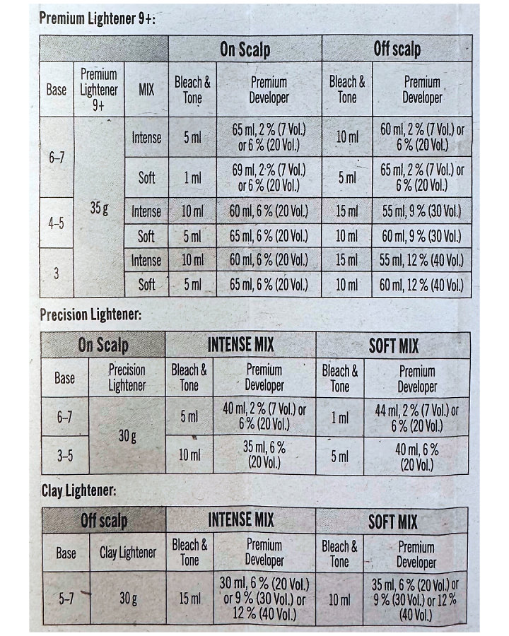 - miešací pomer zvoľte podľa východiskovej hĺbky farby vlasov (riaďte sa odporúčanou tabuľkou výrobcu, viď. nižšie)