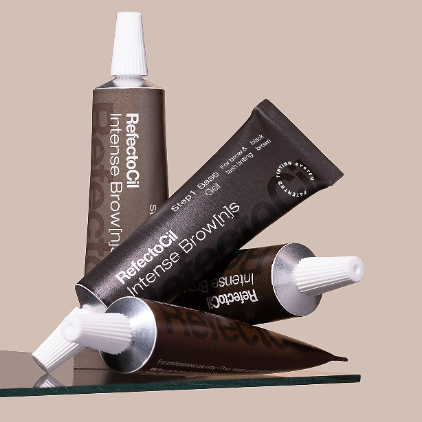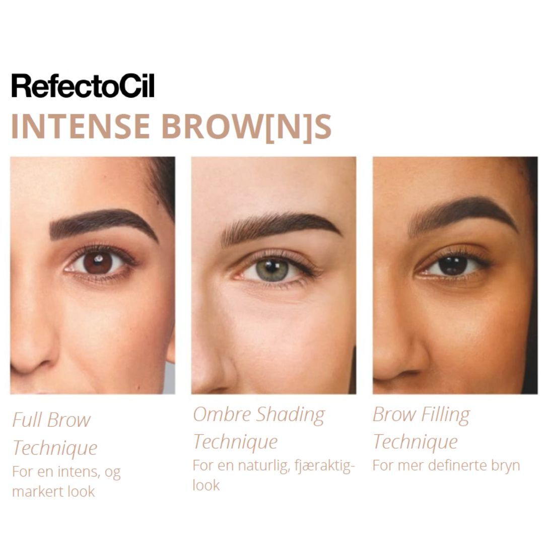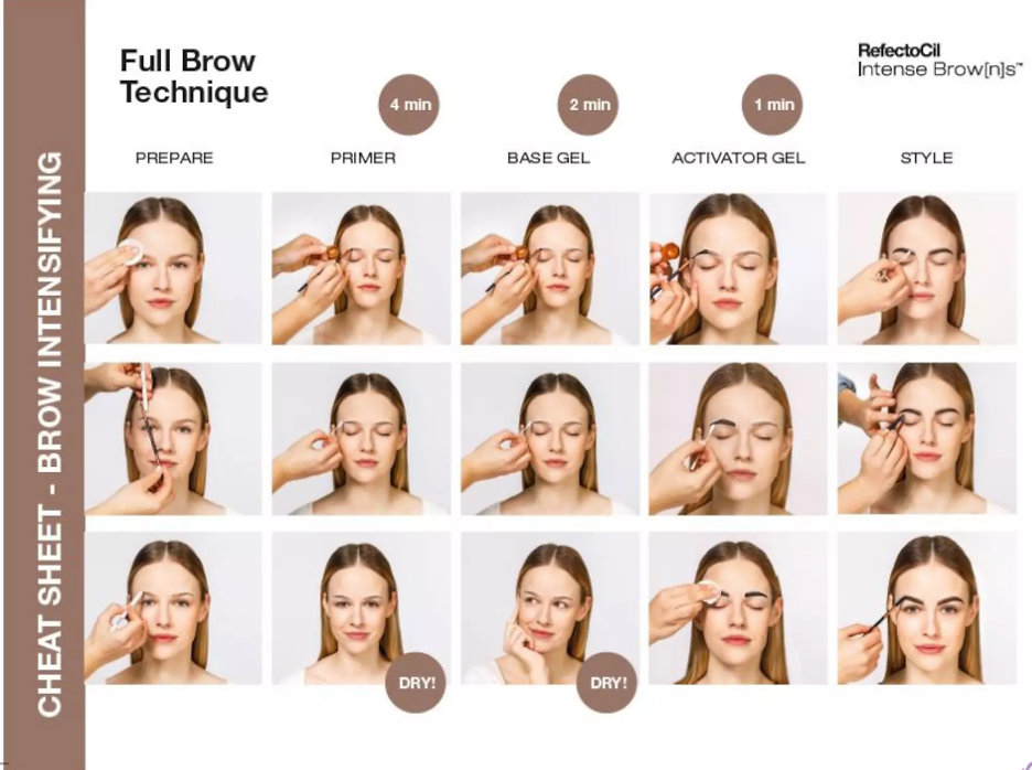 Začnite čistením a predkreslením obočia. Potom otvorte tubu podkladovej bázy Refectocil Intense Brows otvorte a vytlačte malé množstvo do mištičky. Potom pomocou štetca nanesiete na obočie a necháte pôsobiť 4 minúty. Po pôsobení odstráňte bázu suchou vatovou tyčinkou a nechajte schnúť. Potom si vezmite čistý štetec, otvorte gélovú farbu, vytlačte do mištičky a aplikujte na obočie. Po dvoch minútach odstráňte farbu a znova nechajte schnúť. Nakoniec aplikujte gélový aktivátor, ponechajte minútu a odstráňte vlhkým tampónom. Na odstránenie nežiaduceho sfarbenia použite odstraňovač farby RefectoCil.