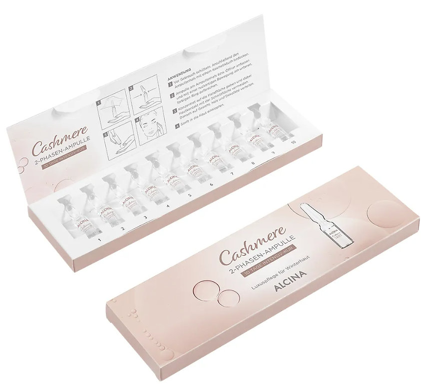 Dvojfázová intenzívna starostlivosť Alcina Cashmere sa aplikuje na vyčistenú pleť ráno alebo večer ako intenzívna starostlivosť počas 10 dní. Počas tohto obdobia je zimou namáhaná pleť rozmaznávaná výživnými olejmi, panthenolom a kašmírovou vôňou. Ošetrenie pomáha udržiavať rovnováhu vlhkosti pleti a chráni ju pred vysúšaním.